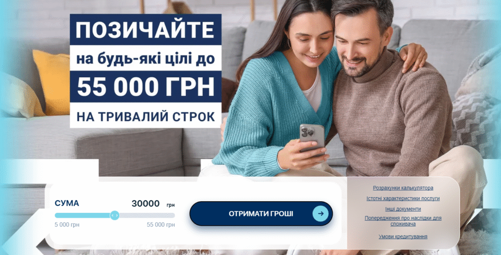 | Споживча | 5000–55 000 грн | Довгострокова | 0,9%/день (гнучко) |