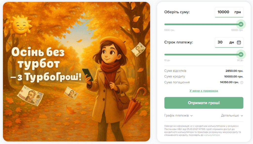 Turbogroshi славиться чесними умовами без сюрпризів. Щоденна ставка — 0,95%, що дає реальну річну від 346,75% у базовому режимі (до 2778,57% залежно від терміну). Комісія за видачу — фіксовані 15% від суми, без прихованих платежів чи додаткових послуг. Наприклад, за 1000 гривень на 360 днів з платежами кожні 30 днів: щомісяця 285 гривень, комісія 150 гривень, загальна переплата ~3420 гривень — усе чітко розраховане. Для 10 000 гривень — платежі по 1900 гривень кожні 20 днів, комісія 1500 гривень, переплата ~34 200 гривень. Штрафи за прострочку мінімальні, а сервіс надсилає нагадування, щоб ви завжди були в курсі. З промокодами ставка знижується — це бонус за лояльність!